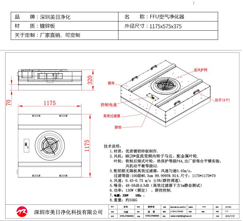 FFU風機過濾機組控制采用其公司開發之非接觸感應式三檔調速,電路均采用電器開關控制,控制安全平穩。彈性、多元化配置除標準機型外,可根據客戶需求,制作不同規格的非標產品。如:風管連接法蘭、濾網、箱體材質等變更。人性化設計機組附裝不銹鋼把手,使搬運及安裝更為方便快捷。