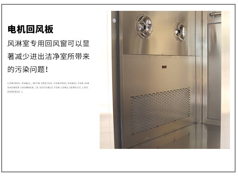 風淋室是一種通用性較強的局部凈化設備,安裝于潔凈室與非潔凈室之間。當人與貨物要進入潔凈區時需經風淋室吹淋,其吹出的潔凈空氣可去除人與貨物所攜帶的塵埃,能有效的阻斷或減少塵源進入潔凈區。風淋室/貨淋室的前后兩道門為電子互鎖,又可起到氣閘的作用,阻止未凈化的空氣進入潔凈區域。