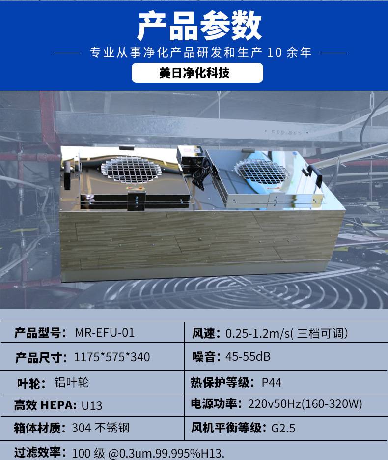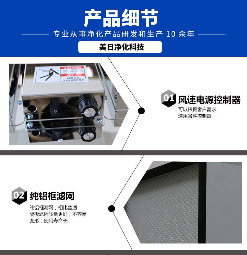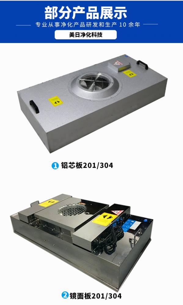 FFU風機過濾機組控制采用其公司開發之非接觸感應式三檔調速,電路均采用電器開關控制,控制安全平穩。彈性、多元化配置除標準機型外,可根據客戶需求,制作不同規格的非標產品。如:風管連接法蘭、濾網、箱體材質等變更。人性化設計機組附裝不銹鋼把手,使搬運及安裝更為方便快捷。